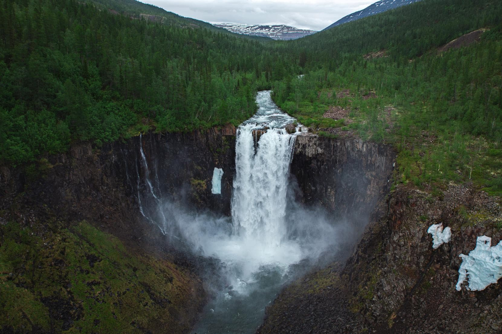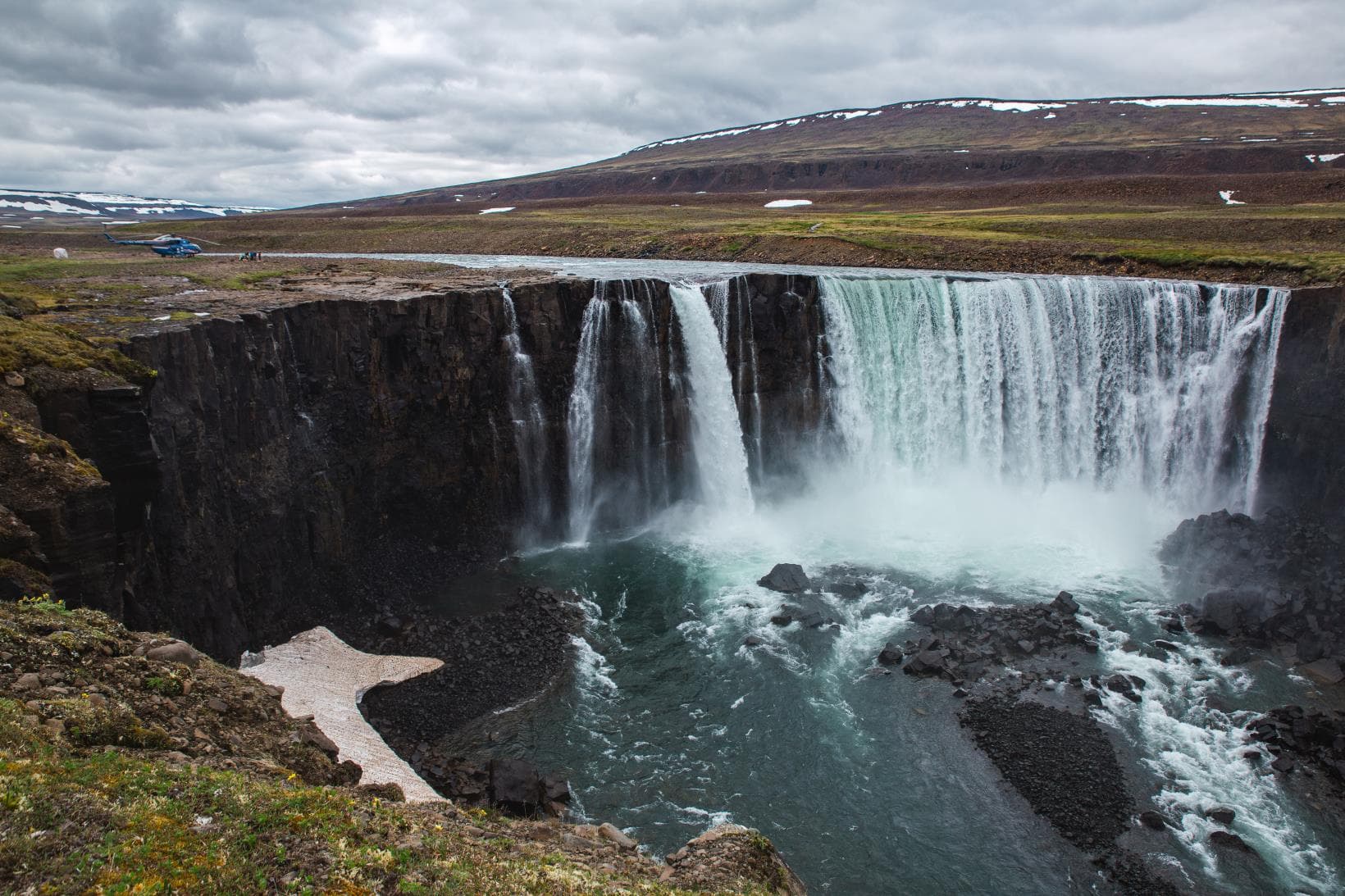 Первая остановка на одном из самых живописных водопадов плато — Большом Иркиндинском. Местные называют его Китабо-Орон, что в переводе означает «грохочущая вода». Гул от этого водопада разносится на несколько километров. Его слышно даже в вертолёте через звук работающего двигателя и вращение лопастей.