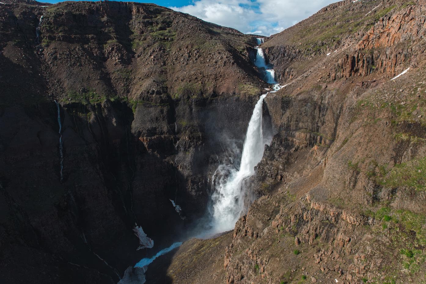 На фоне грандиозных стен ущелья водопад представляет невероятно эпическую картину. Водный поток не делится и не рассеивается, мощным и ровным потоком он срывается с вертикально вниз.