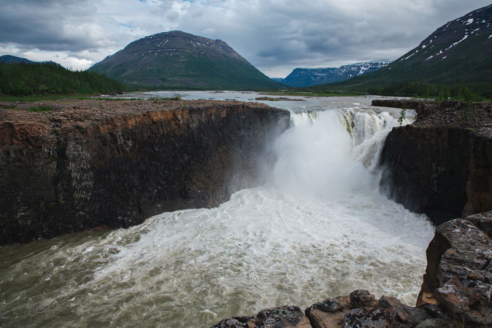 Первая остановка на одном из самых живописных водопадов плато — Большом Иркиндинском. Его высота — 27 метров, а над мощным потоком воды в солнечную погоду образуется красивая радуга.